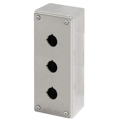 DESCRIÇÃO: Botoeira, 040X0820-8P3, em aço inox, dimensões 82x202x85mm, IP66 e IP69K, sem entrada de cabos e tampa com 3 furos 22mm centralizados, CE/UL/CSA