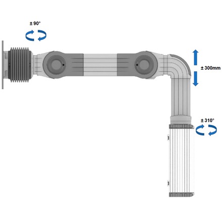Braço articulado montado com base para fixação em superfície vertical e com rotação de 315º, perfil vertical, união com rotação 90º, perfil horizontal com altura ajustável +-300mm, suporte para painel em 90º com rotação 310º e basculante +-45º, em alumínio