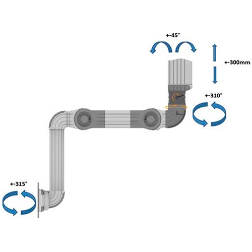 Braço articulado montado com base para fixação em superfície vertical e com rotação de 315º, perfil vertical, união com rotação 90º, perfil horizontal com altura ajustável +-300mm, suporte para painel em 90º com rotação 310º e basculante +-45º, em alumínio