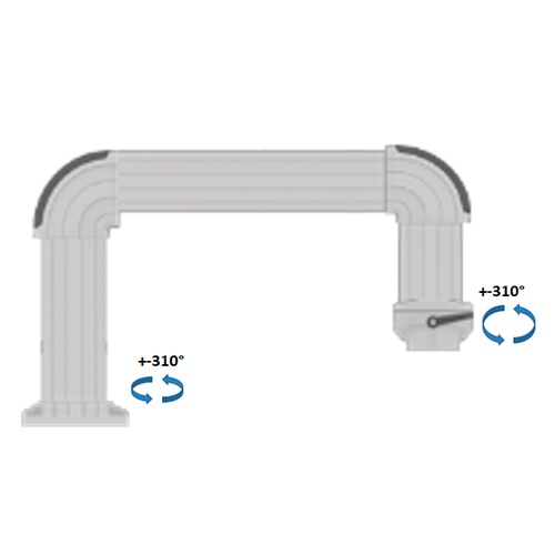 Braço articulado montado com base estática para fixação em superfície horizontal, perfil vertical e suporte para painel com rotação de 310º, em alumínio
