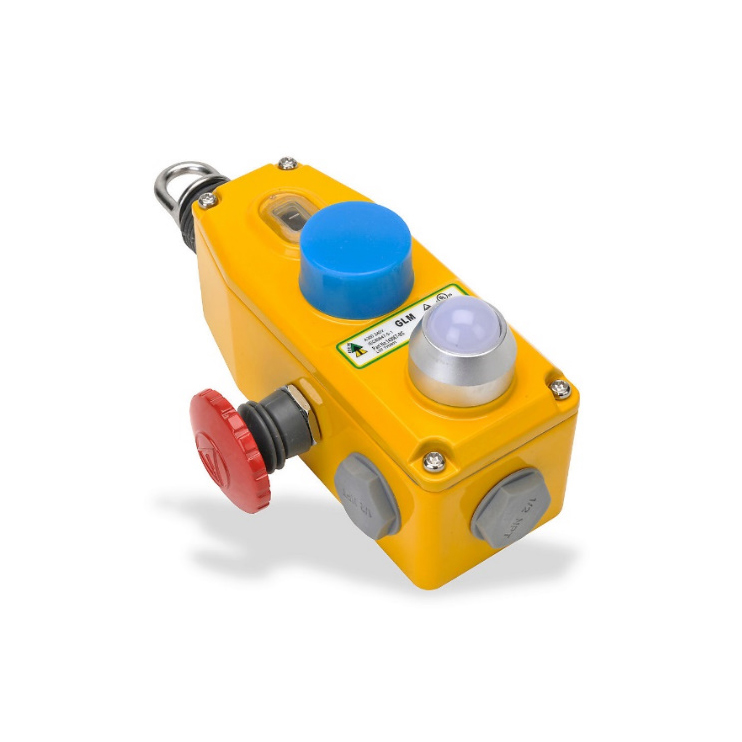 A chave de emergência GLM é um interruptor que trabalha com o acionamento manual de um cabo tracionado, sendo que quando o cabo perde a tração (cabo rompido) ou ganha uma tração maior (atuação manual), a segurança é ativada comutando seus contatos elétricos.
