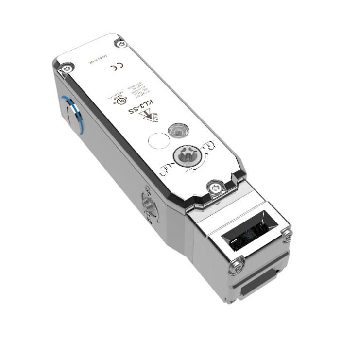 A chave de segurança KL3-SS-P2L trabalha com atuação por lingueta e trava através da energização da solenoide em 24Vcc, com capacidade de até 3000N de retenção, sua liberação é mecânica após desenergização do solenoide.