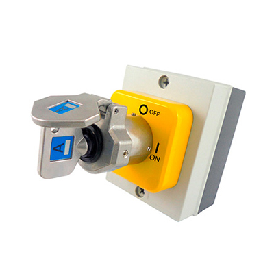 Fabricado em ferro fundido ou aço inox 316 e um alojamento em policarbonato. Quando em posição ‘ON’ (máquina ligada), a chave permanece travada. Quando em posição ‘OFF’ (máquina desligada), a chave é liberada para dar sequência à lógica de proteção. Até que a chave volte ao conjunto comutador, o equipamento, obrigatoriamente, estará desligado.