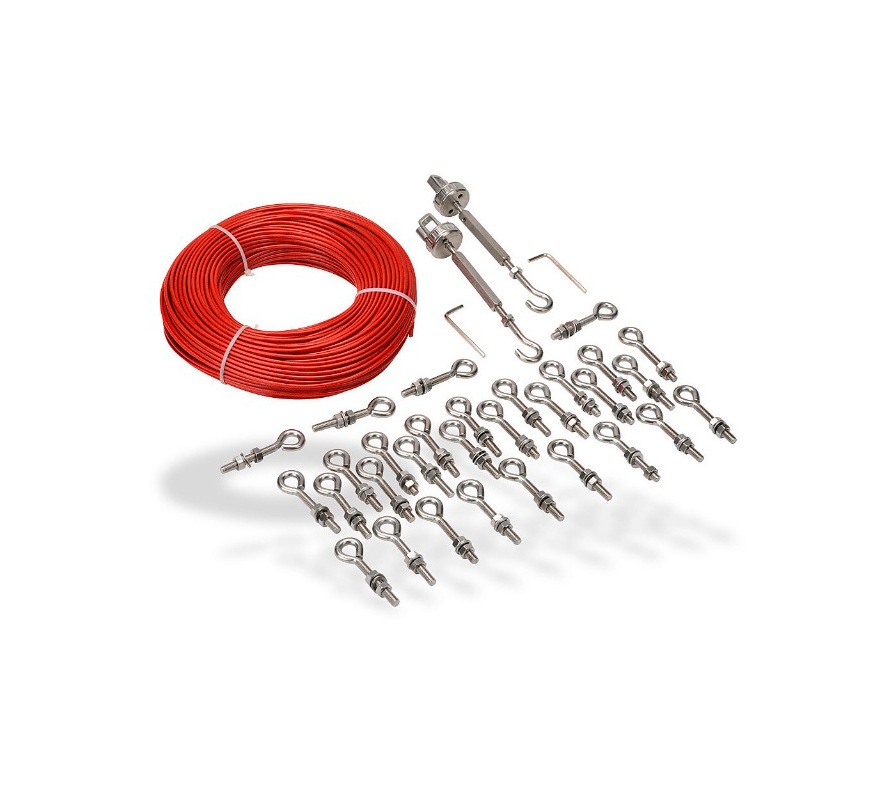 111010000636 | 80m – KIT DE CABO DE ACO INOX ISOLADO POR CAPA DE PVC VERMELHA, C/ 80m, P/ CHAVE DE EMERGENCIA, C/ ACESSORIOS (SAPATILHA, TENSOR/ESTICADOR, GRAMPO, PARAF. OLHAL 84mm E MOSQUETAO), POSSUI RESISTENCIA UV E A AMBIENTE MARITMO | |